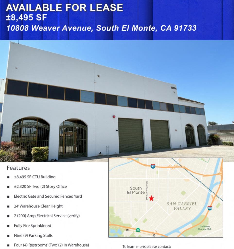 The property at 10808 Weaver Ave, situated in South El Monte, CA, offers an industrial space encompassing 8,495 square feet. Built in 1997, it features a single split HVAC system, a clear height of 24 feet, and is designed as a multi-tenant facility. The building includes two drive-in doors and is equipped with various fire sprinkler systems catering to different hazard levels.